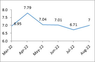 The effective measures undertaken by our Government and Reserve bank of India are becoming visible as inflation in both WPI and CPI segments has come significantly down from its peak in the months of April- May 2022 with the deceleration in prices of many key commodities which are expected to returning back to the pre pandemic level. India has followed calibrated approach and undertaken a moderate monetary policy tightening. The positive sign of this decision of India’s central bank is evident from declining inflationary trends, wherein the WPI inflation has come down to 12.4% in August 2022 from its peak of 16.6% in May 2022 and CPI inflation has fallen to 7% in August 2022 from its peak of 7.79 in April 2022. The deceleration in WPI and CPI has come in tandem with the significant correction in the key international commodity prices such as crude oil and steel.