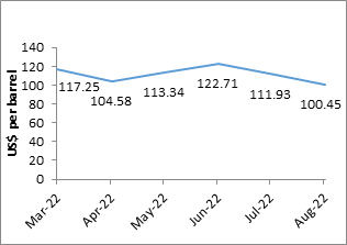 5 | Crude oil (Per barrel) | 117.3 | 107.5 | 100.3 | 100.45 | 91.58 | -14.4% |