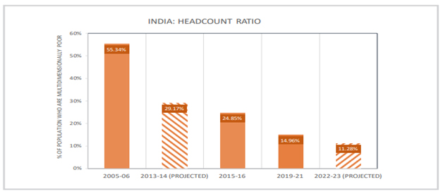 Recently, a Progress Review -2023’ report on the Multidimensional Poverty Index (MPI) of the National Multidimensional Povertyby Niti Aayog, Government of India indicates that the Poverty Headcount Ratio in India has witnessed a commendable decline from 29.2% in 2013-14 to 11.2% in 2022-23, this is marking an extraordinary reduction of 17.8 percentage points from 2014-15 to 2022-23. This monumental achievement is underscored by the fact that around 25crore Indians have successfully escaped multidimensional poverty over the last nine years. The Government, during the last nine years, has focused significantly on the multi dimensions of the downtrodden with the broad based strategies to pull them out of poverty.